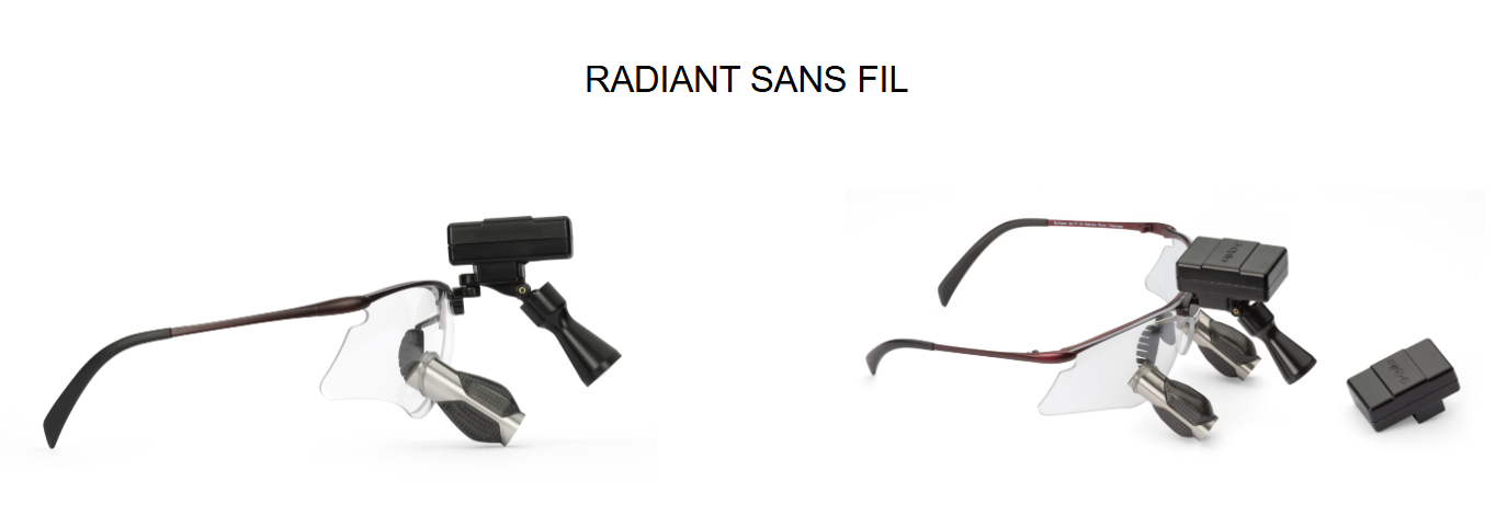 La lampe frontale sans fil Radiant™ offre l’une des conceptions sans fil les plus légères qui s’adapte à la plupart des cadres de loupe disponibles avec une répartition uniforme du poids. Cette lampe frontale sans fil exceptionnellement légère ajoute peu de poids à vos loupes à moins de 26 grammes et fonctionne à froid pour vous permettre de travailler confortablement tout au long des procédures.