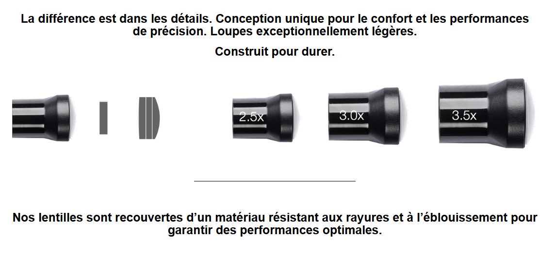 • Le poids n’a cependant pas été ignoré, car ces loupes pèsent toujours en moyenne 25 grammes de moins que les systèmes optiques standard.